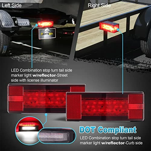 - FUNCTIONS& LEDS: Rectangular combination tail lights are designed to serve 7 functions on trailers over 80″ wide when properly mounted: Stop, tail, turn, side marker, side reflex, rear clearance, rear reflex and Built-in license plate light on driver’s-side light illuminates license plate; Left light have 22 diodes which include 4 diodes for license plate light function,Right light have 18 diodes , applied for Trucks,trailers,tractors,Dump trailer,bus,Utility boat,RV,Camper cargo,etc