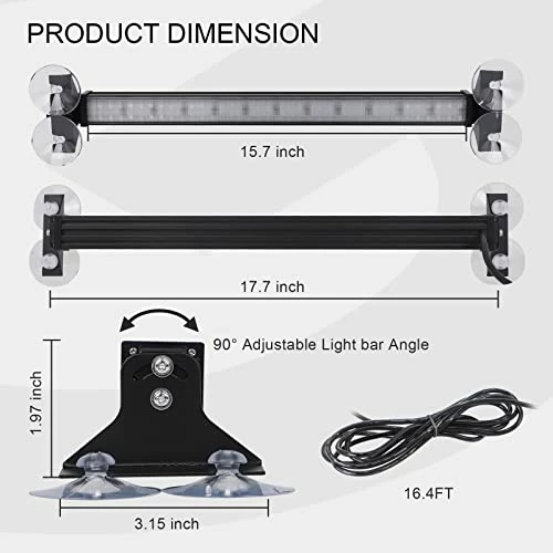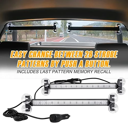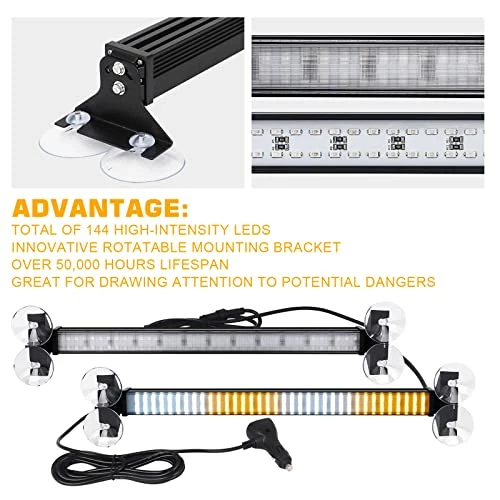 - UPGRADED – This windshield traffic advisor strobe light bar has a total of 144 high-intensity Led chips, using floodlight PC lens, which can maximize the light output. Visible in day and night and lifespan over 50,000 hours. Innovative rotatable mounting bracket, which can be installed on any horizontal, inclined or vertical surface.