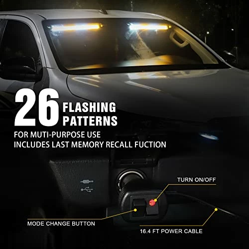 - 26 STROBE FLASH PATTERNS – 12V power, plug and play cigarette plug, convenient dual-switch design. One to turn on/off power supply, one to switch between 26 different flash modes . Including the last mode memory recall. These modes provide warnings for potential imminent dangers.