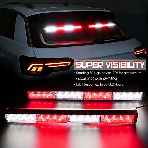 - SUPER VISIBILITY — Boasting 32 High-power LEDs for a maximum output of 64 watts (2W/LEDs), this LED emergency dash light projects brilliantly bright illumination during the day and nighttime. LED Lifespan up to 50,000 Hours.