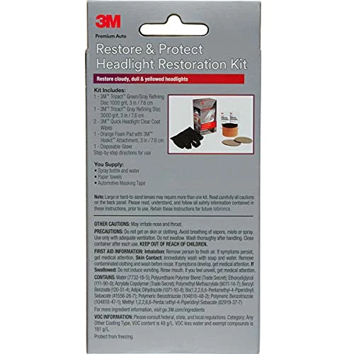 - KIT INCLUDES: 1 – 3M Trizact Refining Disc 1000 grit, 3 in/7.6 cm, 1 – 3M Trizact Refining Disc 3000 grit, 3 in/7.6 cm, 2 – 3M Quick Headlight Clear Coat Wipes, 1 – Foam Pad with 3M Hookit Attachment, 3 in/7.6 cm, 1 – Disposable Glove