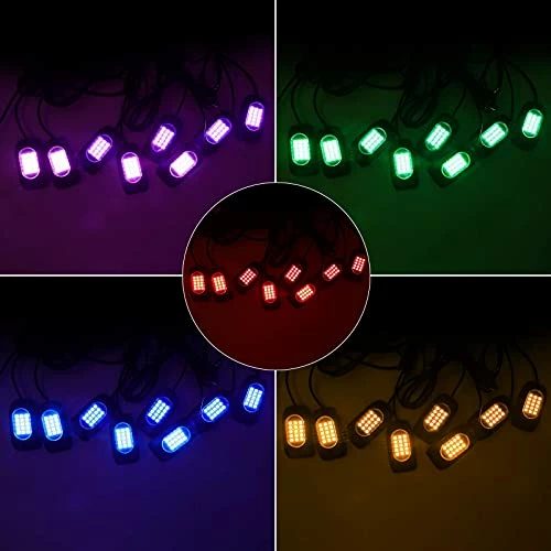 - 【8 PODS 15 LEDS BRIGHT RGB LED ROCK LIGHTS WITH 4PCS EXTENSION WIRES】Work perfectly on trucks,sedans, suv, atv, utv, boats, Each Rock light equipped 15 bright SMD LEDS, Bright and Colorful lights make your car look more attractive at night. Come with 4.9 feet of wire per light, you can add more extension wires as you like. Extension wire asin: B08Y8VB8W9
