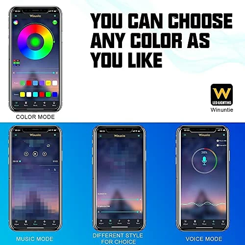 - 【CUSTOM COLORS. USE APP OR 20 KEYS REMOTE CONTROL PAD TO CUSTOM COLORS】 Choose any color as you want. You can use Winunite app to select music mode, 29 Strobe modes, voice mode. You can also click the color wheel on app to custom colors. You can also use 20 keys remote control pad to select colors and color changing modes.
