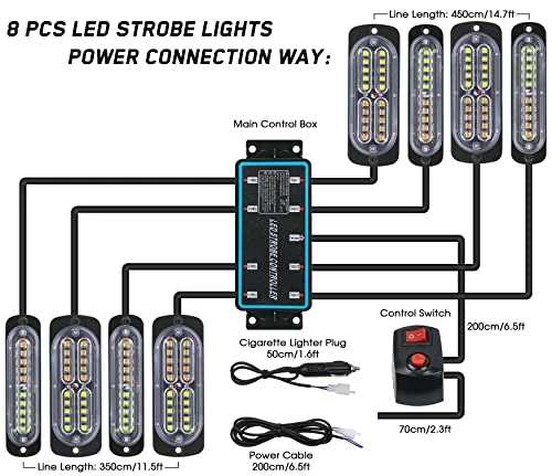 - Light Size: Dimensions of 24LED strobe light: 4.41′(L)X1.65′(W)X0.38(D), Dimensions of 12LED strobe light: 4.3″ (L) 1.1 ” (W) x 0.38″ (D); 4 pcs Light to Main Control Box: 4m, another 4 Pcs Light to Main Control Box: 3.5m,Main Control Box to Switch: 1.7m,Switch to Plug: 0.8m.