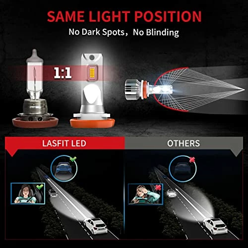 - ????????【PERFECT BEAM PATTERN】: LASFIT H11 9005 led bulbs come with 0.04′ ultra-thin centered light emitting, ensures a super focused beam pattern. With 360° adjustable locker ring, no glare to oncoming traffic, no dark spots, safe and reliable.