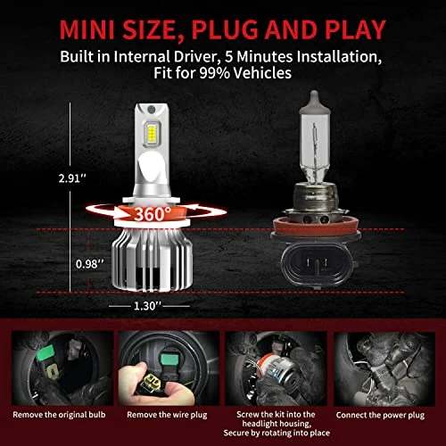 - ????【5-MIN EASY INSTALLATION】: The LED bulb’s lower profile is only 0.98inch, 1:1 design as halogen. Plug and play. Perfectly fit into the housing without modification. Built-in driver, true all in one compact design. Save your time and effort.