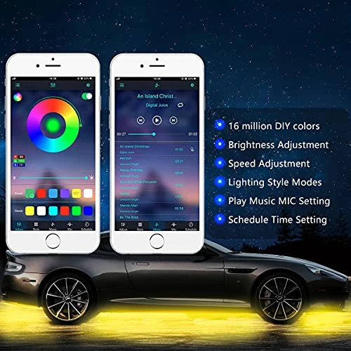 - ???? Incredible Brightness :Smart SoundSync LED UnderGlow Light, built-in high Intensity 3 In 1 RGB LED chip,2pcs 72-LED strips and 2pcs 54-LED strips,High Brightness and Low Consumption, lighting up the entire under car, enhances the stylish look your vehicle