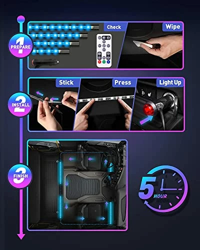 - Two-Line design: boasts 2 lines connecting 4 strip lights, longer wires, makes it easy to securely fasten the light strips anywhere you want, gives the flexibility to install the lights in any car, the wires can be easily hidden.