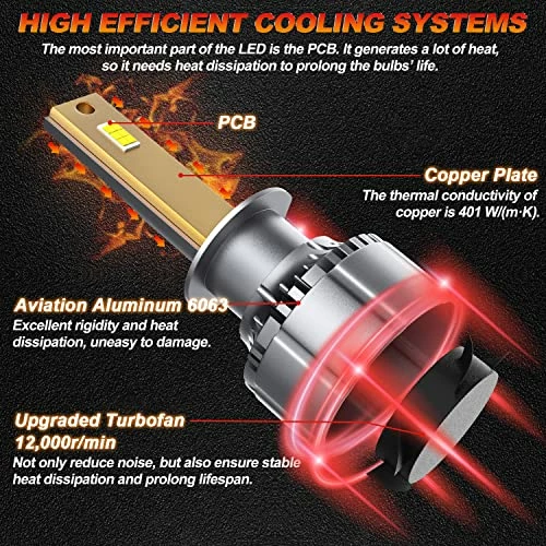 - 【Over 50,000 Hours Lifespan】 IP68 waterproof technology, whole aviation aluminium alloy heat sink, 12,000RPM powerful turbo cooling fan to ensure your LED H1 Headlight Bulbs over 50,000 hours of brilliant continuous light.